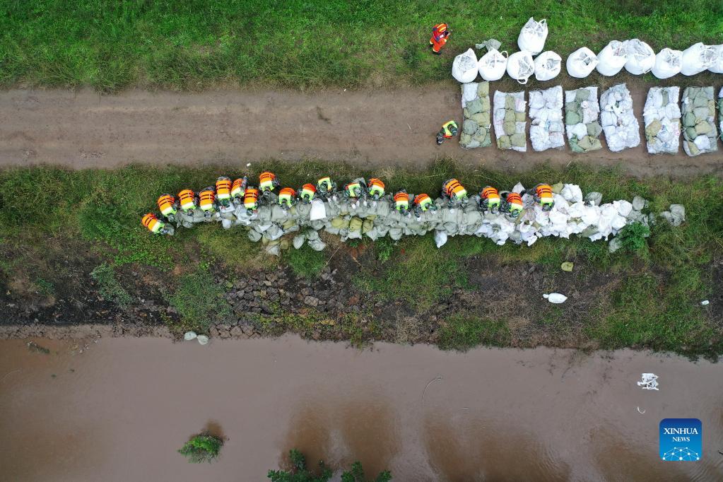 Aerial photo taken on Oct. 11, 2021 shows rescuers reinforcing dyke of the Fenhe River, a tributary of the Yellow River, in Jishan County, north China's Shanxi Province. A dyke crack with a length of more than 10 meters was closed in a section of the Fenhe River in Jishan on Monday. (Xinhua/Zhan Yan)