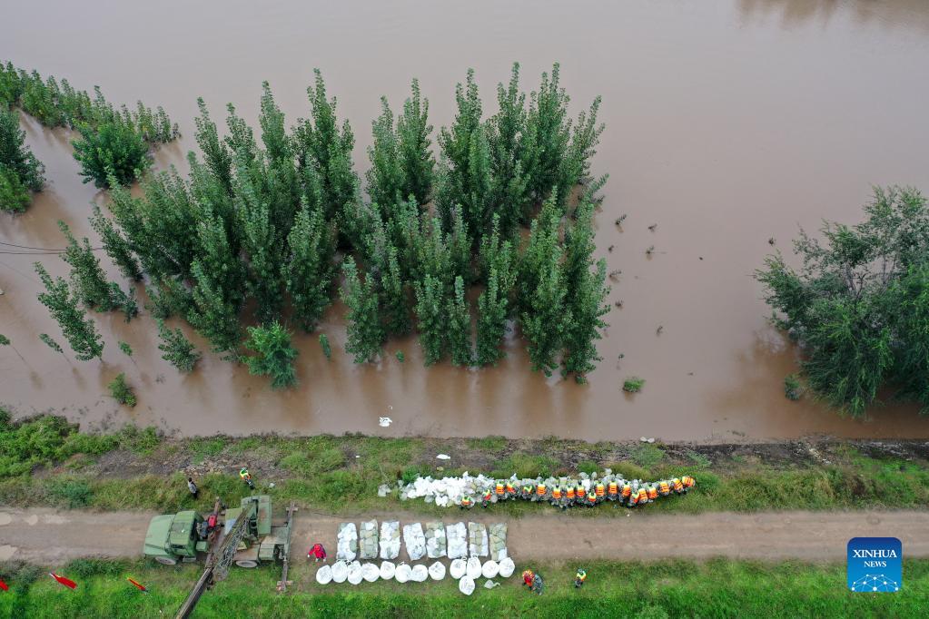 Aerial photo taken on Oct. 11, 2021 shows rescuers reinforcing dyke of the Fenhe River, a tributary of the Yellow River, in Jishan County, north China's Shanxi Province. A dyke crack with a length of more than 10 meters was closed in a section of the Fenhe River in Jishan on Monday. (Xinhua/Zhan Yan)