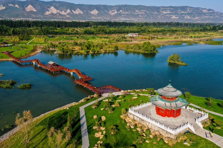 Aerial photo taken on Oct. 1, 2021 shows the scenery along the Fenhe River in Taiyuan, north China's Shanxi Province. (Xinhua/Cao Yang)
