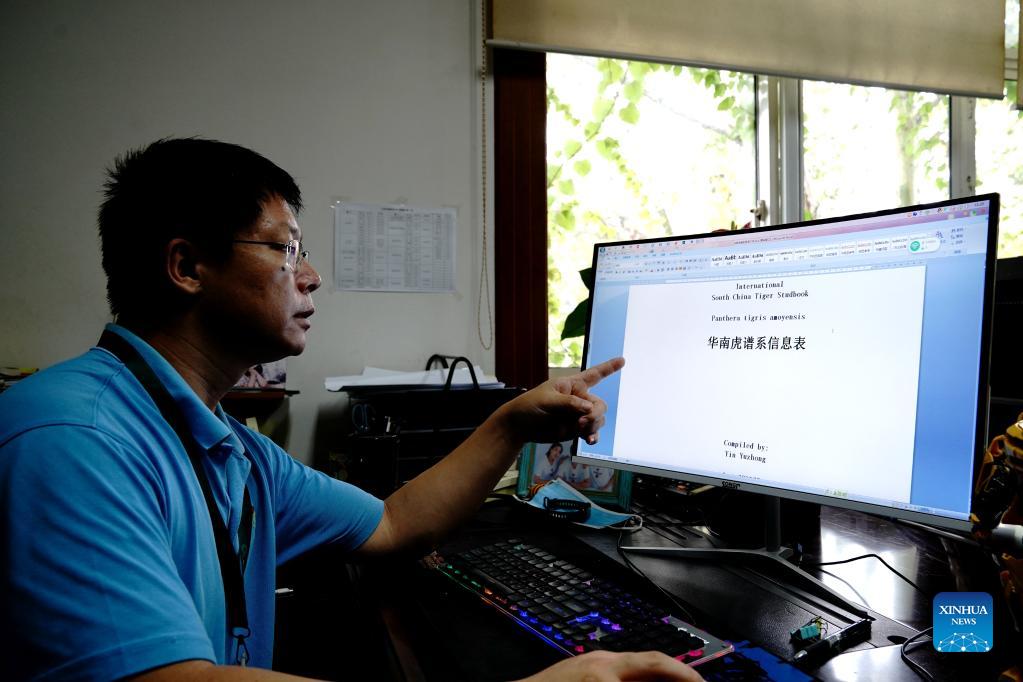 A researcher introduces South China tigers through a studbook at the Shanghai Zoo in east China's Shanghai, Oct. 11, 2021. The South China tiger is a rare kind endemic to China and is on the national first-class protection list. Currently, a total of 28 South China tigers are living in the Shanghai Zoo. The zoo has recorded each tiger's information and established a gene bank for research, and tigers are treated and bred in a scientific way. (Xinhua/Zhang Jiansong)