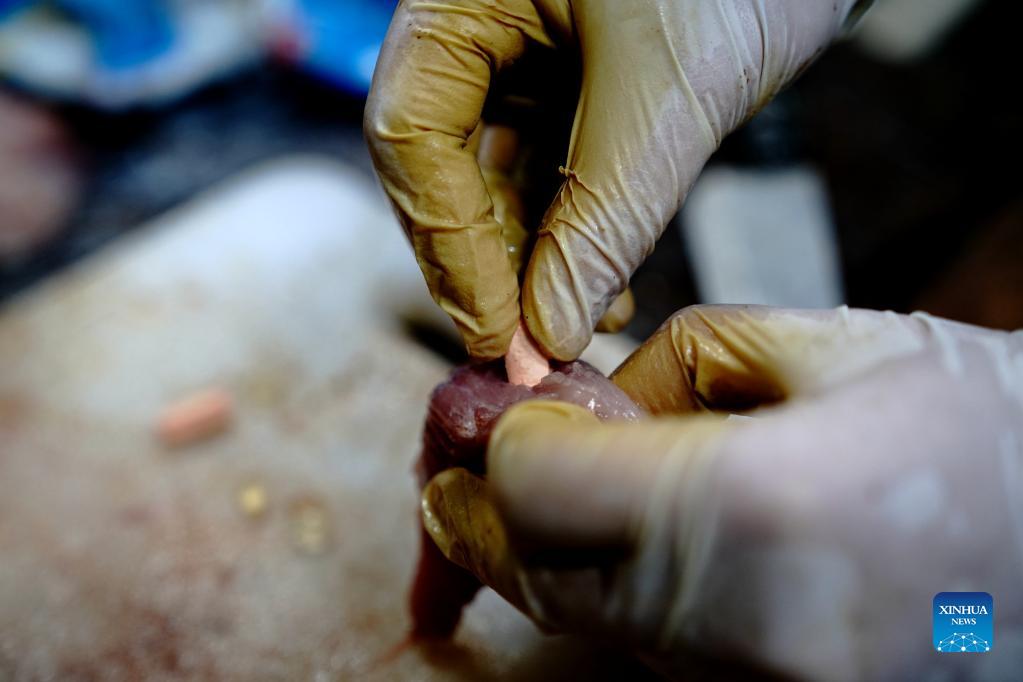 A breeder adds vitamin pills into South China tigers' food at the Shanghai Zoo in east China's Shanghai, Oct. 11, 2021. The South China tiger is a rare kind endemic to China and is on the national first-class protection list. Currently, a total of 28 South China tigers are living in the Shanghai Zoo. The zoo has recorded each tiger's information and established a gene bank for research, and tigers are treated and bred in a scientific way. (Xinhua/Zhang Jiansong)