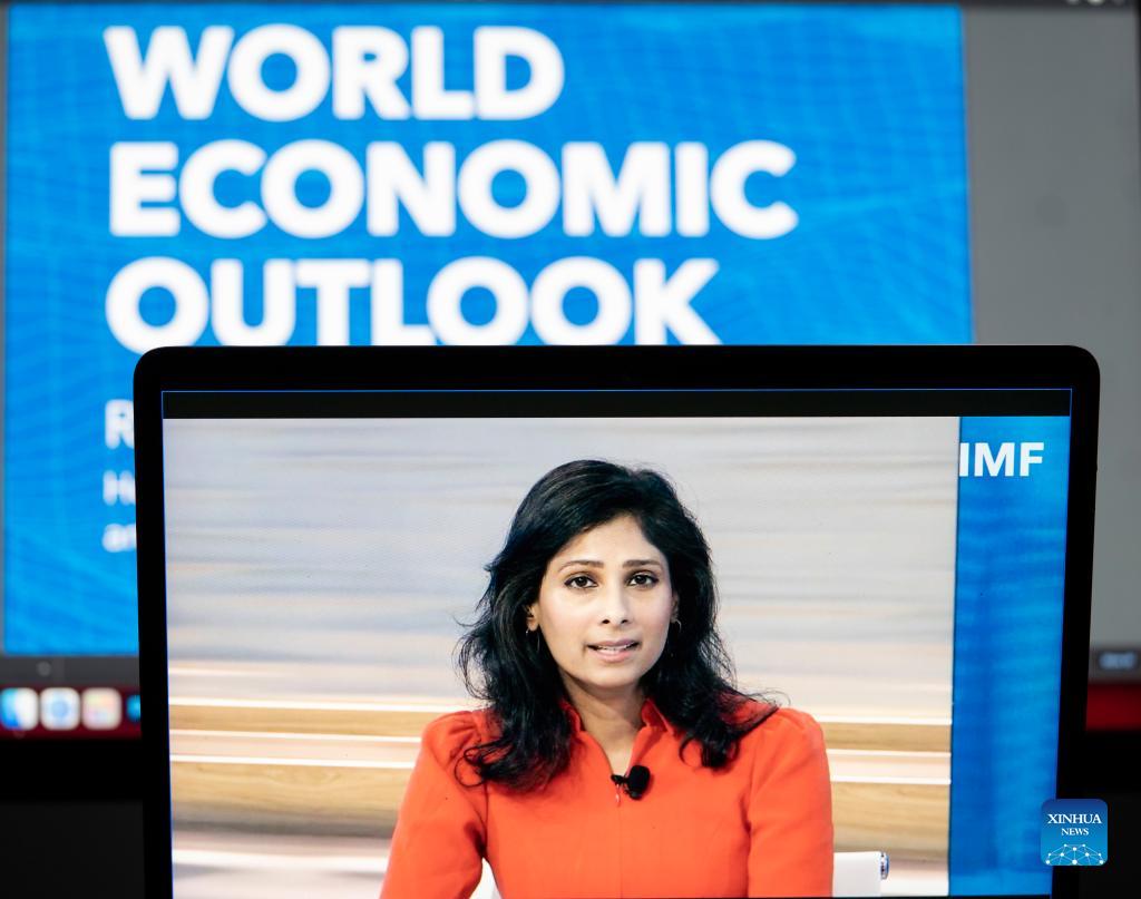 The International Monetary Fund (IMF) Chief Economist Gita Gopinath speaks at a virtual press briefing during the annual meetings of the IMF and the World Bank Group in Washington, D.C., the United States, on Oct. 12, 2021. The International Monetary Fund (IMF) on Tuesday projected that the global economy would grow by 5.9 percent in 2021, down by 0.1 percentage point from July's forecast, according to the latest World Economic Outlook (WEO). (Xinhua/Liu Jie)