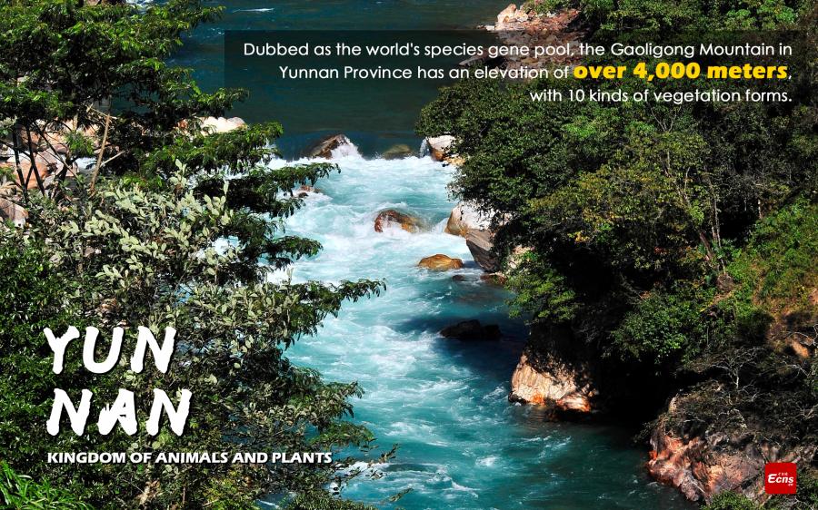 Dubbed as the world's species gene pool, the Gaoligong Mountain in Yunnan Province has an elevation of over 4,000 meters, with 10 kinds of vegetation forms.