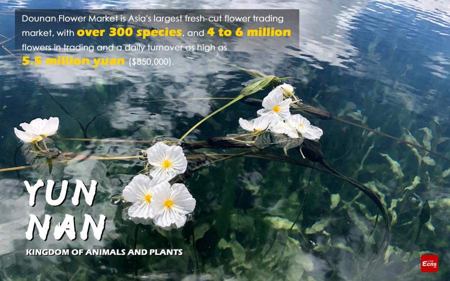 Dounan Flower Market is Asia's largest fresh-cut flower trading market, with over 300 species, and 4 to 6 million flowers in trading and a daily turnover as high as 5.5 million yuan ($850,000).