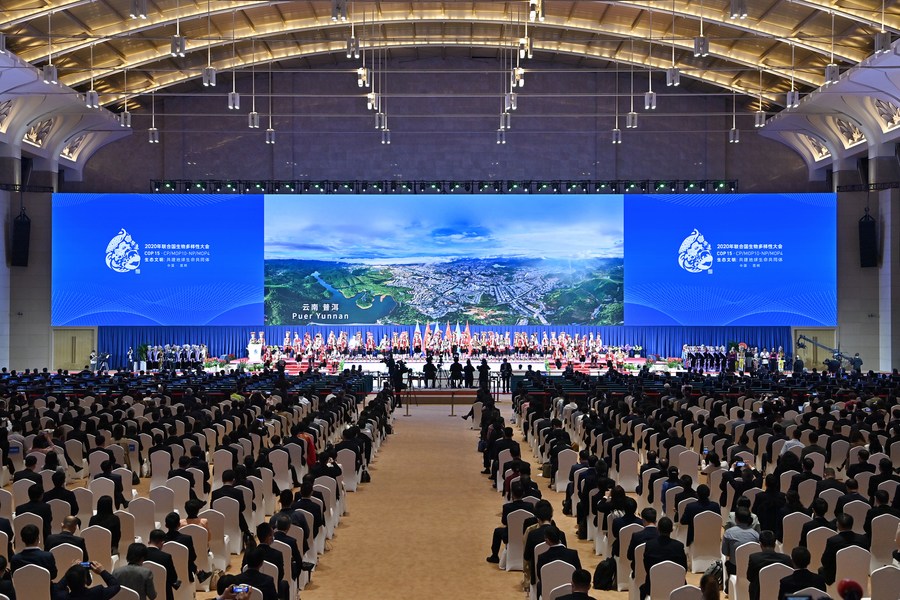 Photo taken on Oct. 11, 2021 shows the opening ceremony of the 15th meeting of the Conference of the Parties to the Convention on Biological Diversity (COP15) in Kunming, southwest China's Yunnan Province. (Xinhua/Li Xin)