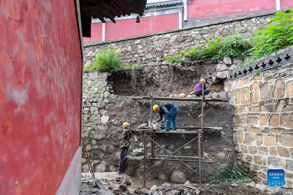 Workers repair a building structure damaged during a flood at the Jinci Temple Museum in Taiyuan, capital of north China's Shanxi Province, Oct. 12, 2021. Shanxi has recently been hit by continuous rainstorms, which led to flooding in multiple parts of the province. More than 1,000 cultural heritage sites and buildings have suffered structural damage due to the extreme weather. Local cultural heritage authority is conducting repair work on the cultural relics damaged in the recent flood. (Xinhua/Cao Yang)