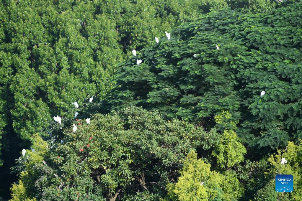 Birds rest on tree canopies by the Nanhu Lake in Nanning, capital of south China's Guangxi Zhuang Autonomous Region, Oct. 12, 2021. (Xinhua/Lu Boan)