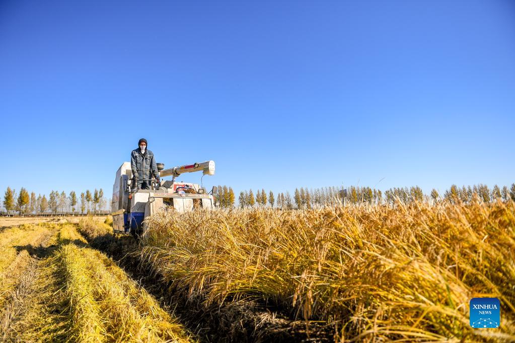 Photo taken on Oct. 12, 2021 shows a farmer operating a rice harvester in Wanchang Town of Yongji County in Jilin City, northeast China's Jilin Province. (Xinhua/Zhang Nan)