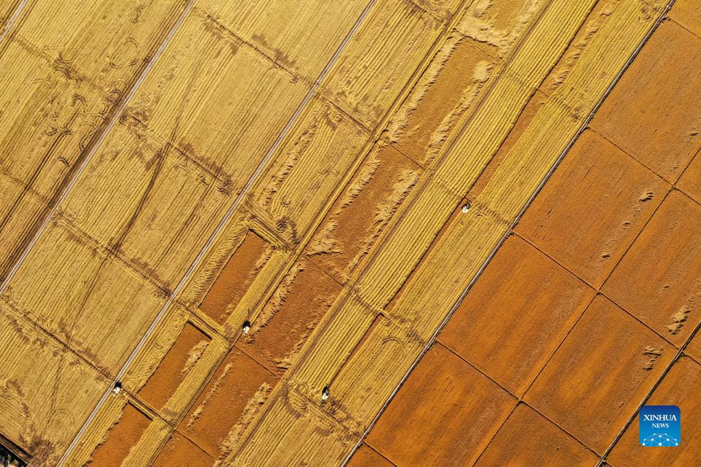 Aerial photo taken on Oct. 12, 2021 shows farmers operating rice harvesters in Wanchang Town of Yongji County in Jilin City, northeast China's Jilin Province. (Xinhua/Zhang Nan)