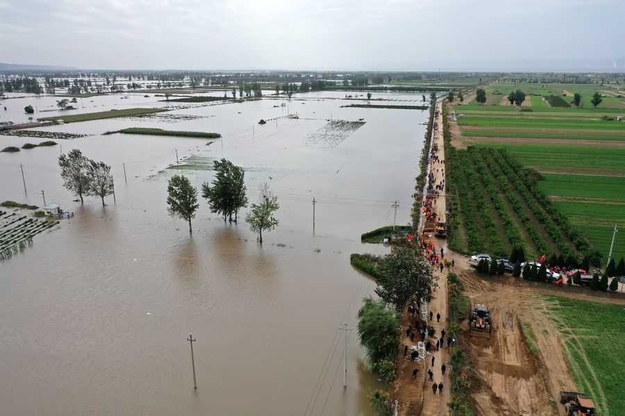 Aerial photo shows rescuers fortifying temporary dyke against the flood at Lianbo Village in Hejin City, north China's Shanxi Province, Oct. 10, 2021. (Xinhua/Zhan Yan)