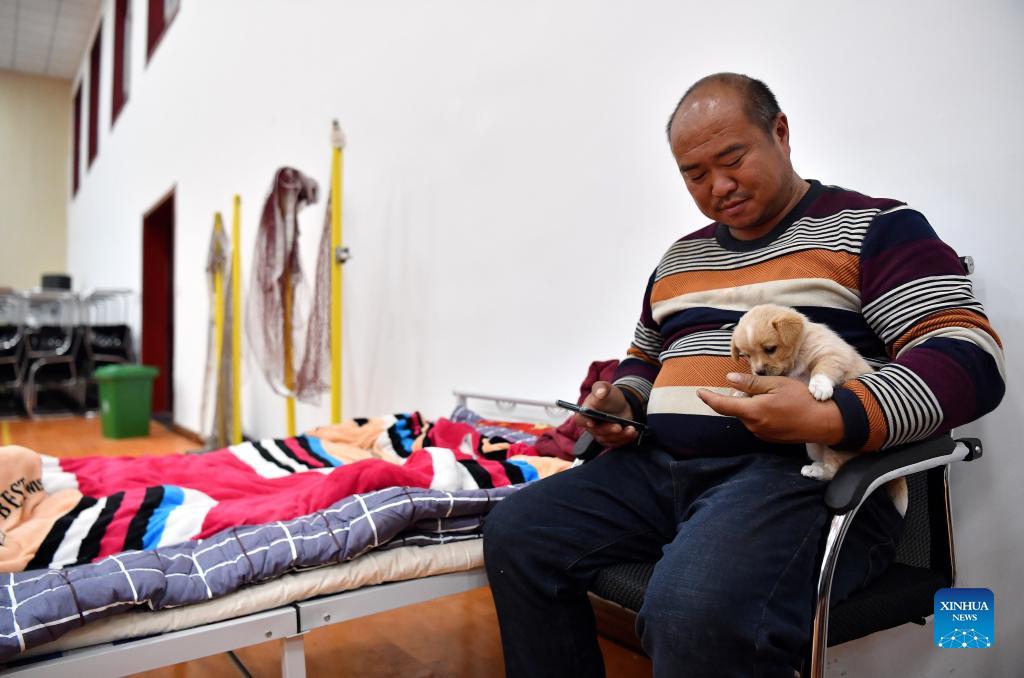 A man holds a puppy at a temporary relocation site in Dali County of Weinan City, northwest China's Shaanxi Province, Oct. 11, 2021. Nearly 240,000 people were affected by the floods due to continuous downpours in Dali County of Shaanxi Province. So far, more than 25,000 people have been evacuated to temporary relocation sites offering accommodation and medical services. (Xinhua/Liu Xiao)