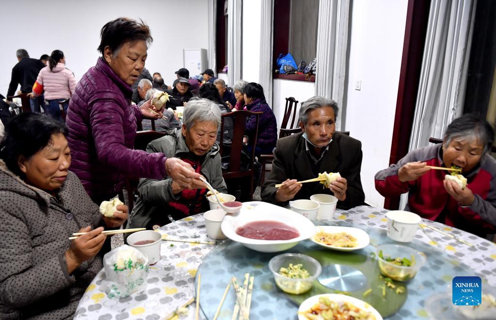 Residents stricken by the flood have dinner at a temporary relocation site in Dali County of Weinan City, northwest China's Shaanxi Province, Oct. 11, 2021. Nearly 240,000 people were affected by the floods due to continuous downpours in Dali County of Shaanxi Province. So far, more than 25,000 people have been evacuated to temporary relocation sites offering accommodation and medical services. (Xinhua/Liu Xiao)