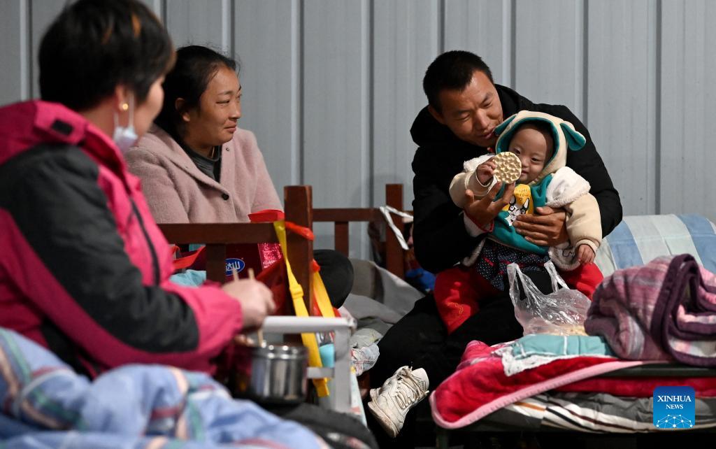 Residents stricken by the flood rest at a temporary relocation site in Dali County of Weinan City, northwest China's Shaanxi Province, Oct. 11, 2021. Nearly 240,000 people were affected by the floods due to continuous downpours in Dali County of Shaanxi Province. So far, more than 25,000 people have been evacuated to temporary relocation sites offering accommodation and medical services. (Xinhua/Liu Xiao)