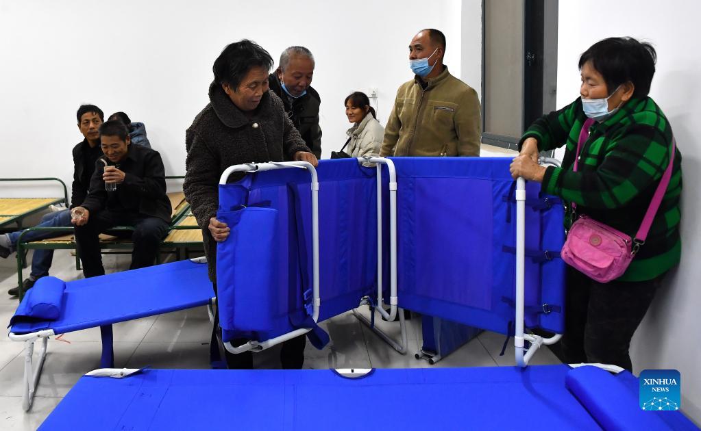 Residents stricken by the flood make bed at a temporary relocation site in Dali County of Weinan City, northwest China's Shaanxi Province, Oct. 11, 2021. Nearly 240,000 people were affected by the floods due to continuous downpours in Dali County of Shaanxi Province. So far, more than 25,000 people have been evacuated to temporary relocation sites offering accommodation and medical services. (Xinhua/Liu Xiao)