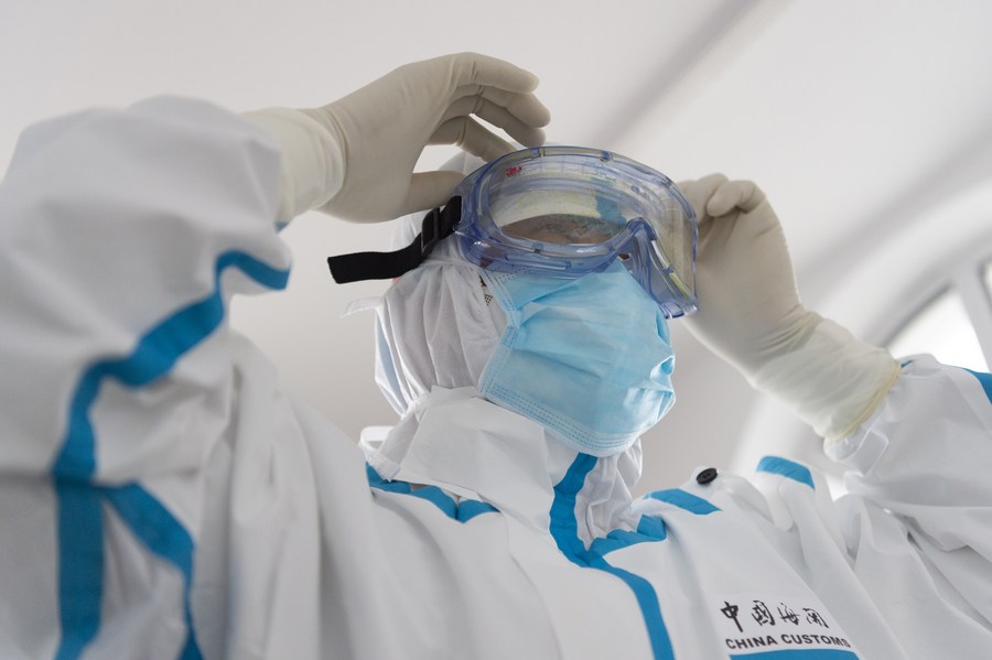 A member of staff puts on protective equipments at the port of Fuyuan in northeast China's Heilongjiang Province, Aug. 13, 2020. (Xinhua/Xie Jianfei)