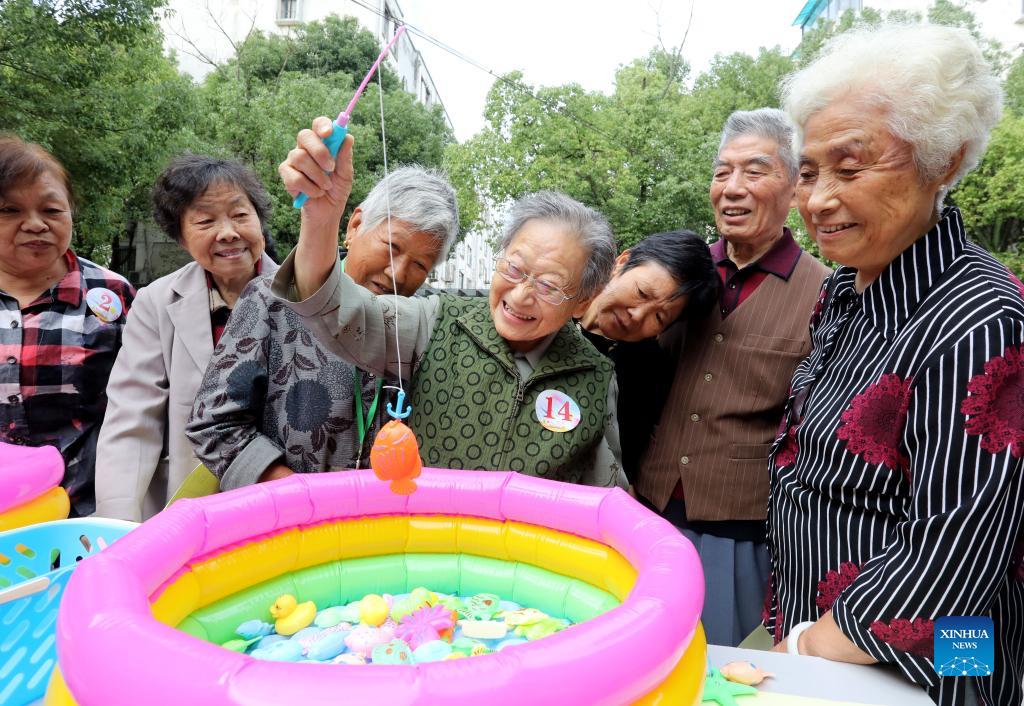 (211013) -- SUZHOU, Oct. 13, 2021 (Xinhua) -- Senior residents participate in fishing games in Jinxia Community of Suzhou City, east China's Jiangsu Province, Oct. 12, 2021. The Double Ninth Festival or the Chongyang Festival is approaching. A series of celebration activities were held across the country. (Photo by Hang Xingwei/Xinhua)