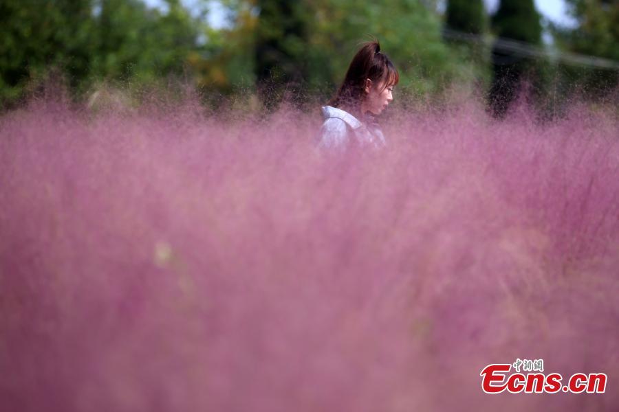 A women poses for photos in a field of pink grass (muhlenbergia capillaris) in Nanjing, capital of east China's Jiangsu Province, Oct.12, 2021. Muhly grasses create pink mist attracting many tourists. (Photo/China News Service)