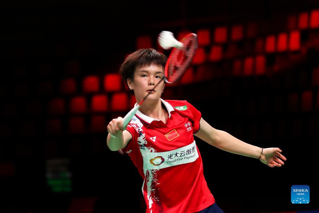 Wang Zhiyi of China competes in the women's singles match against Line Hojmark Kjaersfeldt of Denmark during a group D match between China and Denmark at Uber Cup badminton tournament in Aarhus, Denmark, Oct. 12, 2021. (Xinhua/Zhang Cheng)