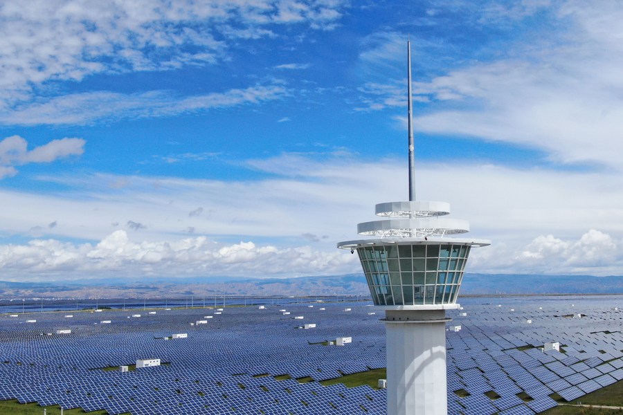 Aerial photo taken on Aug. 17, 2020 shows a photovoltaic power station at the green industrial development park in the Tibetan Autonomous Prefecture of Hainan, northwest China's Qinghai Province. (Xinhua/Zhang Long)