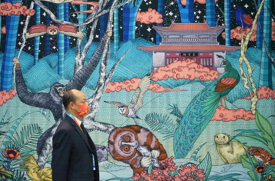 Photo taken on Oct. 12, 2021 shows the interior view of the media center of the 15th meeting of the Conference of the Parties to the Convention on Biological Diversity, known as COP15, in Kunming, southwest China's Yunnan Province. COP15 kicked off in Kunming on Oct. 11. (Xinhua/Chen Junqing)