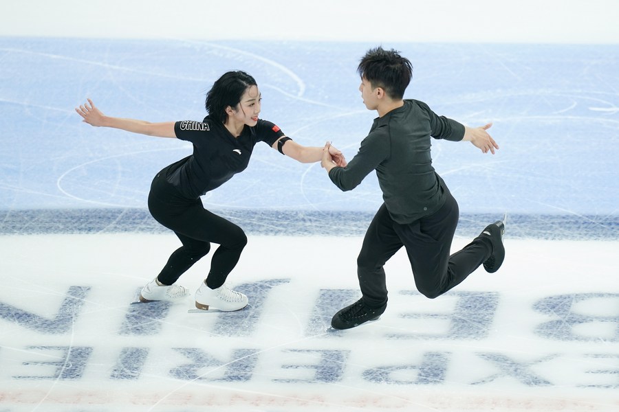 China's Sui Wenjing (L) and Han Cong practice before the Asian Open Figure Skating competition gets underway at the Capital Gymnasium in Beijing on Oct. 13, 2021. (Xinhua/Ju Huanzong)