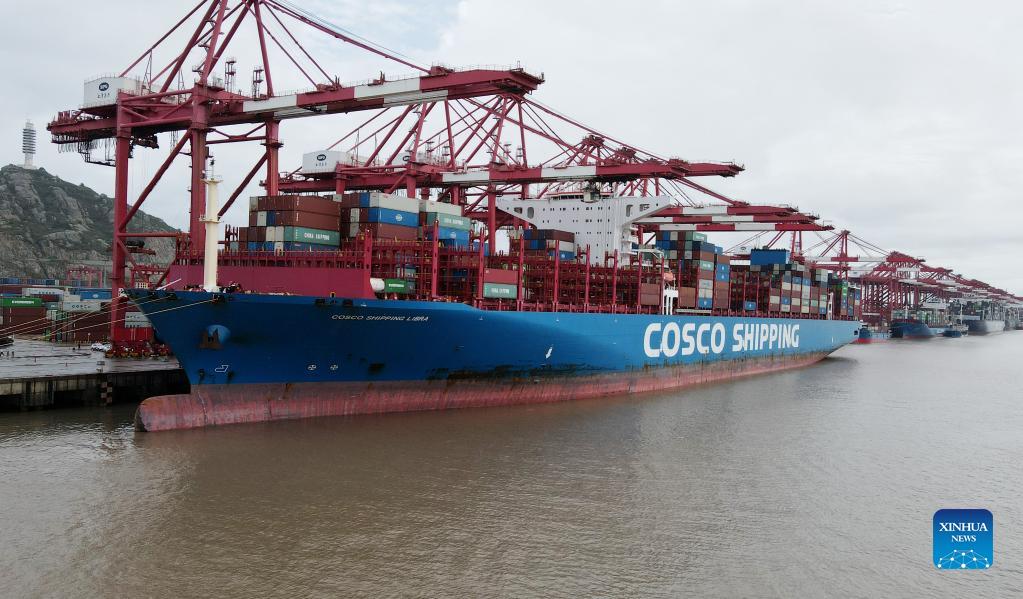 Aerial photo taken on Oct. 13, 2021 shows the container ship Libra of China's COSCO Shipping at Shanghai Yangshan Port, east China. The first batch of exhibits by sea for the fourth China International Import Expo (CIIE) arrived at Shanghai on Wednesday. (Xinhua/Fang Zhe)
