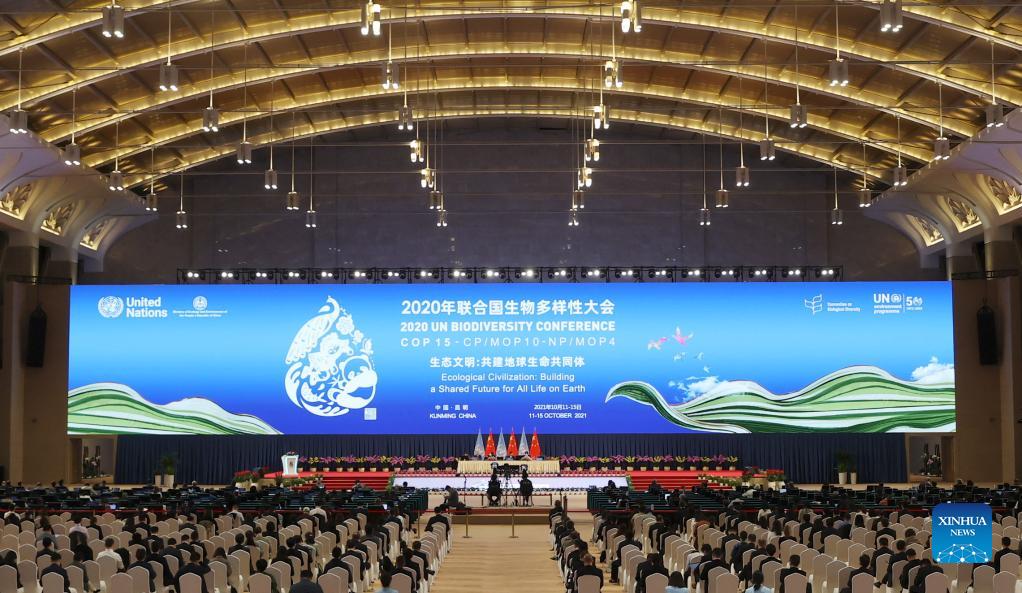 Photo taken on Oct. 13, 2021 shows the closing plenary of the High-Level Segment of the first part of the 15th meeting of the Conference of the Parties to the Convention on Biological Diversity (COP15) in Kunming, southwest China's Yunnan Province. (Xinhua/Wang Nan)