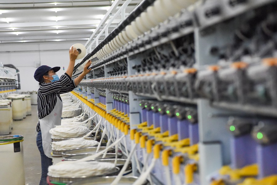 File photo shows a worker busy working in a workshop of a textile company in Yuli County of northwest China's Xinjiang Uygur Autonomous Region, Aug. 24, 2020. (Xinhua/Ding Lei)