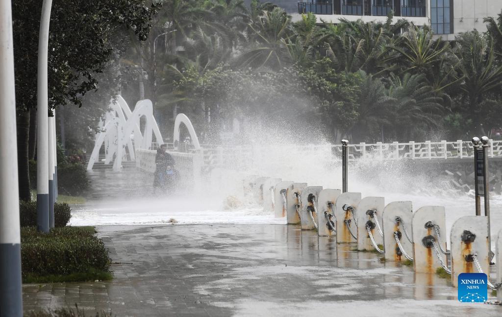 A citizen rides through waves in Haikou, capital of south China's Hainan Province, Oct. 13, 2021. Typhoon Kompasu, the 18th typhoon of this year, made landfall in south China's island province of Hainan on Wednesday afternoon. (Xinhua/Yang Guanyu)