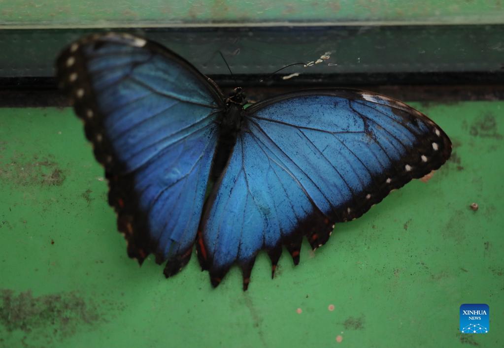 A blue morpho butterfly is seen at a zoo in Jerusalem on Oct. 12, 2021. An exhibition stepping into the world of butterflies opened this month at the zoo. (Photo by Gil Cohen Magen/Xinhua)