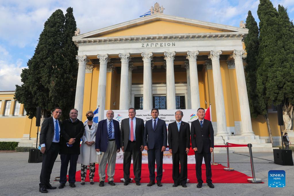 Guests pose for photo at the inauguration ceremony of the culture of the Winter Olympics of Beijing 2022 World Photography Exhibition (Greece) in Athens, Greece, Oct. 13, 2021. (Xinhua/Zheng Huansong)