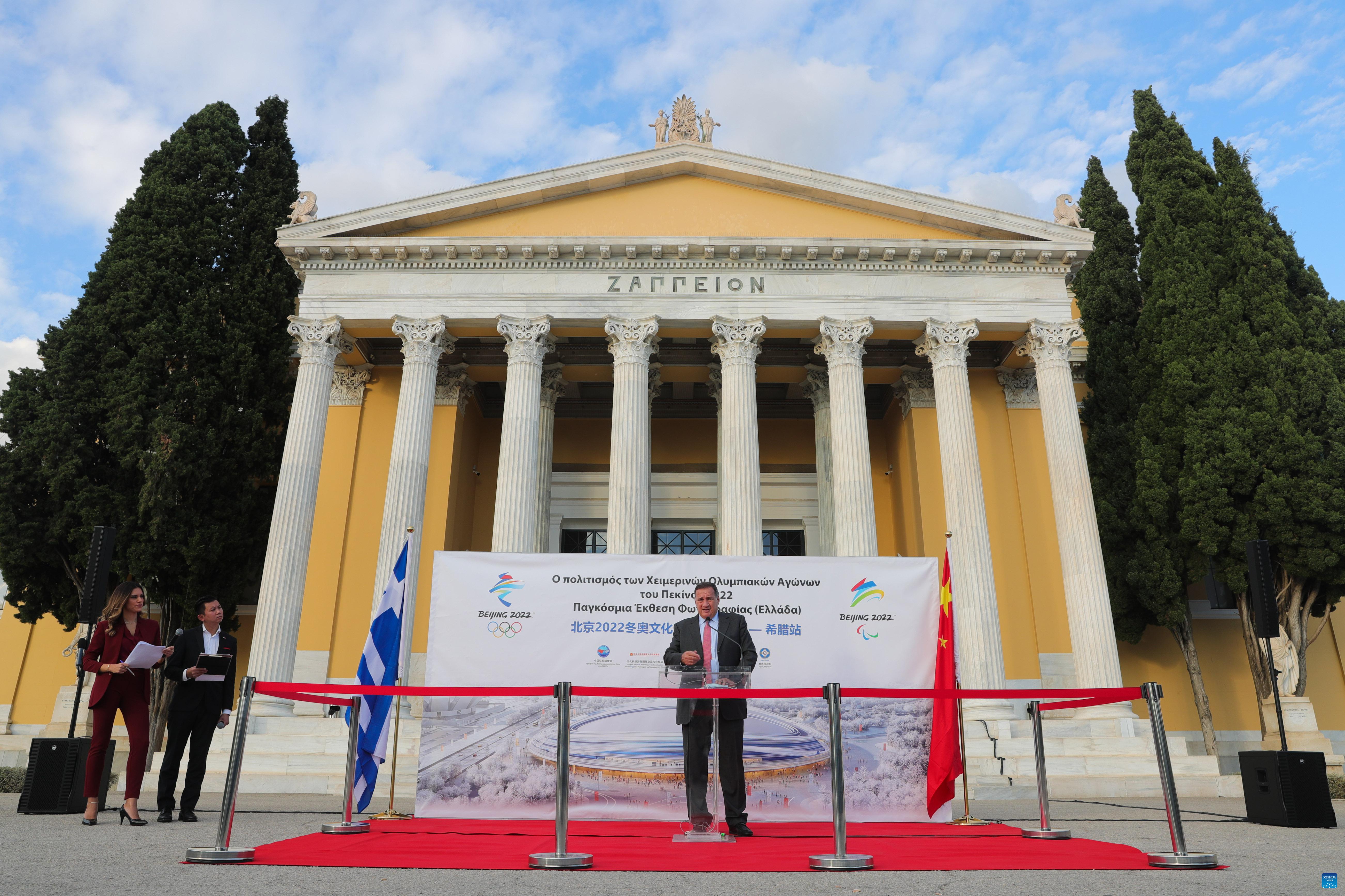 Spyros Capralos, President of the Hellenic Olympic Committee and member of the International Olympic Committee, speaks at the inauguration ceremony of the culture of the Winter Olympics of Beijing 2022 World Photography Exhibition (Greece) in Athens, Greece, Oct. 13, 2021. (Xinhua/Zheng Huansong)