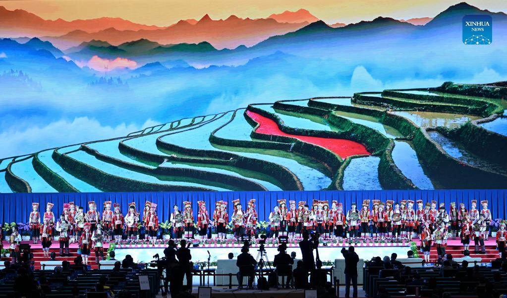 A performance is held at the opening ceremony of the Ecological Civilization Forum of the first part of the 15th meeting of the Conference of the Parties to the Convention on Biological Diversity (COP15) in Kunming, southwest China's Yunnan Province, on Oct. 14, 2021. (Xinhua/Chen Yehua)