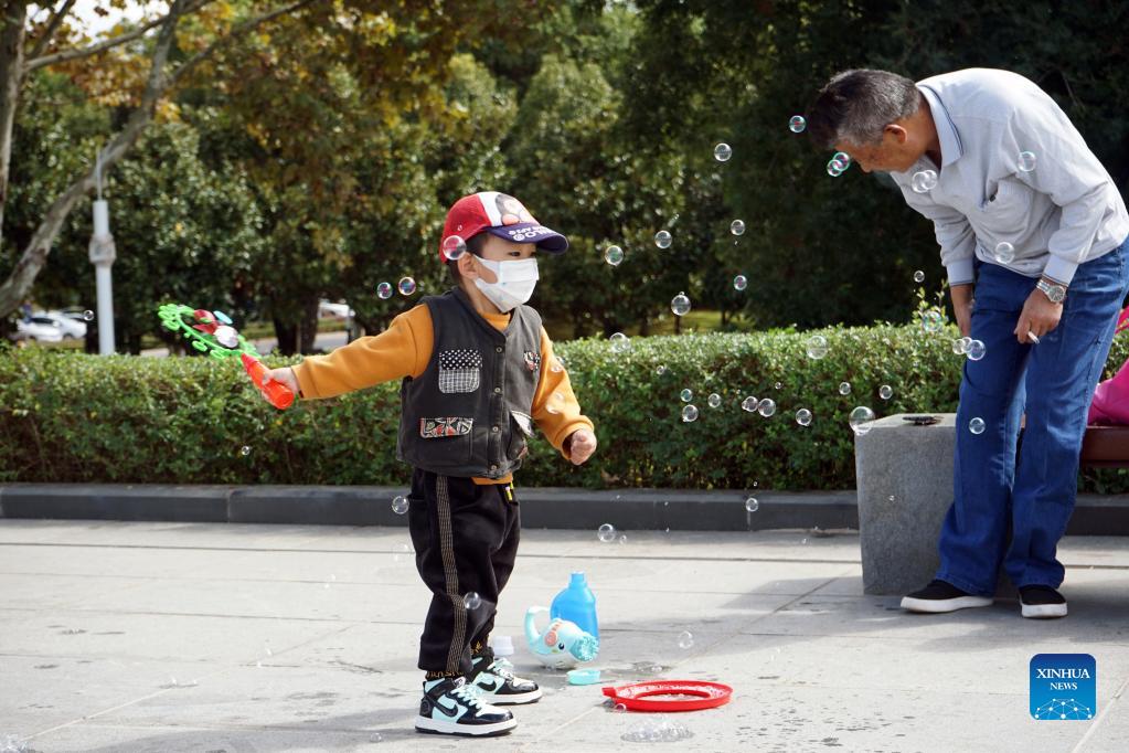 A kid plays with a bubble machine near the Dianchi Lake in Kunming, southwest China's Yunnan Province, Oct. 13, 2021. (Xinhua/Li Yahui)