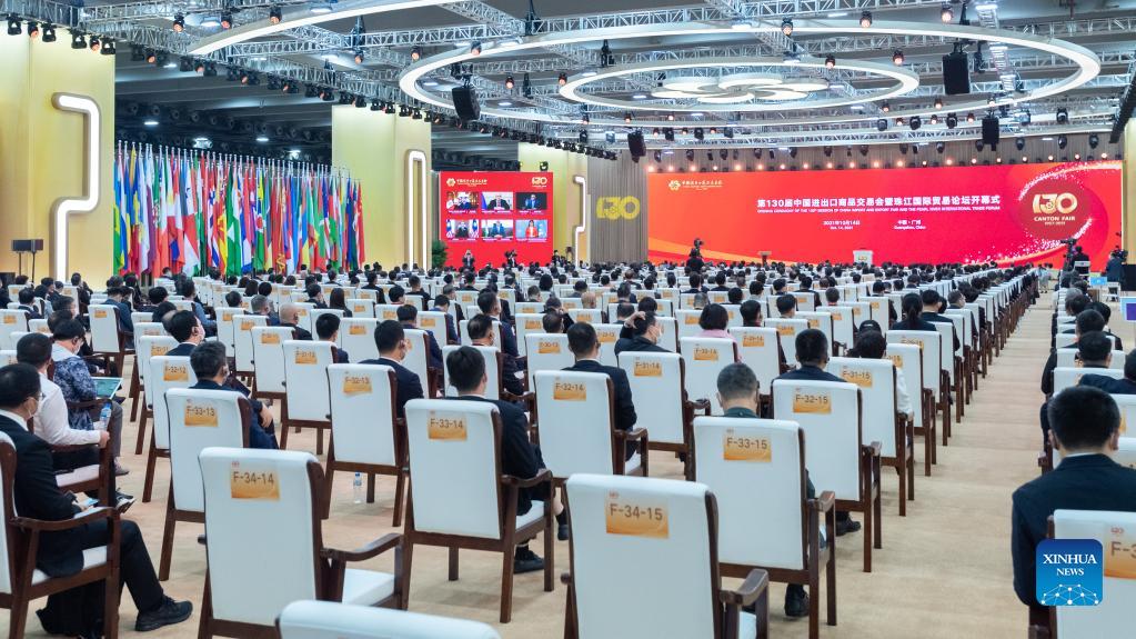 Photo taken on Oct. 14, 2021 shows the opening ceremony of the 130th session of the China Import and Export Fair in Guangzhou, capital of south China's Guangdong Province. The fair, which is also known as the Canton Fair, opened on Thursday in Guangzhou. (Xinhua/Zhai Jianlan)