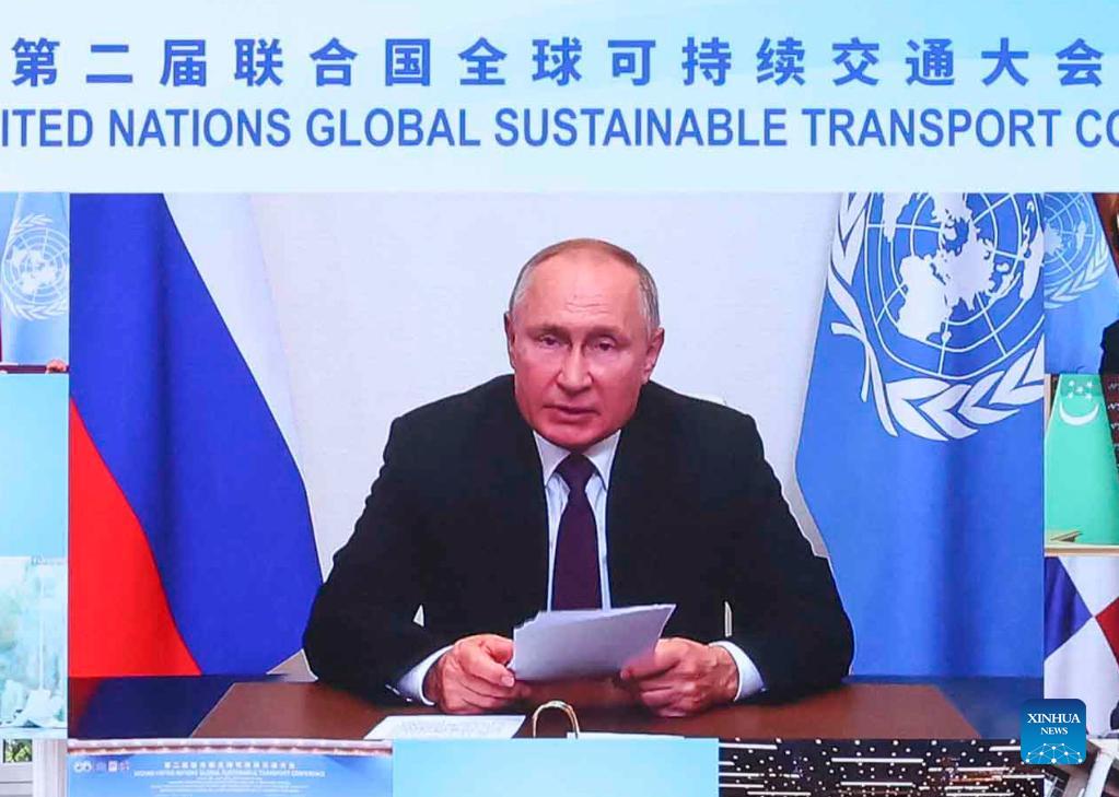 Russian President Vladimir Putin speaks via video link at the opening ceremony of the Second United Nations Global Sustainable Transport Conference, Oct. 14, 2021. The Second United Nations Global Sustainable Transport Conference kicked off on Thursday in Beijing. The three-day conference will be held both online and offline. (Xinhua/Yin Gang)