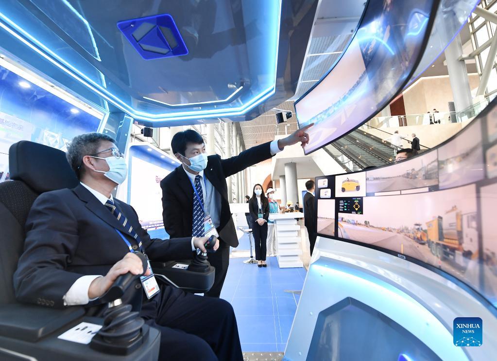 Visitors are seen at the venue of the Second United Nations Global Sustainable Transport Conference in Beijing, capital of China, Oct. 14, 2021. The Second United Nations Global Sustainable Transport Conference kicked off on Thursday in Beijing. The three-day conference will be held both online and offline. (Xinhua/Li He)