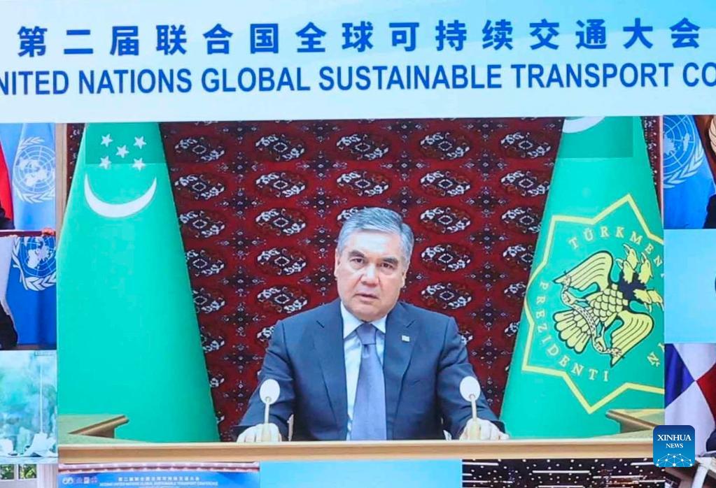 Turkmen President Gurbanguly Berdimuhamedov speaks via video link at the opening ceremony of the Second United Nations Global Sustainable Transport Conference, Oct. 14, 2021. The Second United Nations Global Sustainable Transport Conference kicked off on Thursday in Beijing. The three-day conference will be held both online and offline. (Xinhua/Yin Gang)