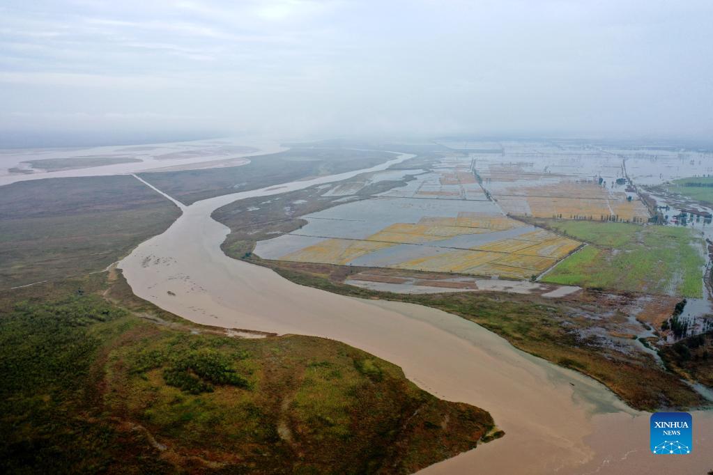 Aerial photo taken on Oct. 14, 2021 shows the confluence of the Yellow River and Fenhe River in Miaoqian Village of Wanrong County, Yuncheng, north China's Shanxi Province. The water level of Hejin section of the Fenhe River in Yuncheng has dropped to 376.39 meters. (Xinhua/Zhan Yan)
