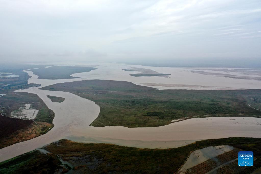 Aerial photo taken on Oct. 14, 2021 shows the confluence of the Yellow River and Fenhe River in Miaoqian Village of Wanrong County, Yuncheng, north China's Shanxi Province. The water level of Hejin section of the Fenhe River in Yuncheng has dropped to 376.39 meters. (Xinhua/Zhan Yan)
