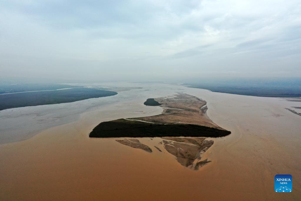 Aerial photo taken on Oct. 14, 2021 shows the confluence of the Yellow River and Fenhe River in Miaoqian Village of Wanrong County, Yuncheng, north China's Shanxi Province. The water level of Hejin section of the Fenhe River in Yuncheng has dropped to 376.39 meters. (Xinhua/Zhan Yan)