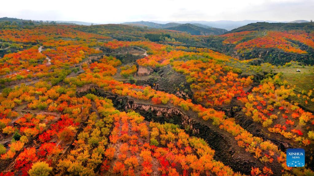 Aerial photo taken on Oct. 14, 2021 shows the red leaves in Hanjialiang Village of Guta Town, Yulin City, northwest China's Shaanxi Province. (Xinhua/Tao Ming)