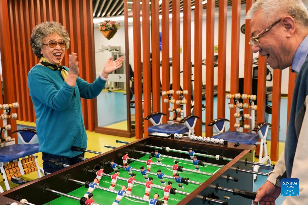 Lyu Weiye (R) and his wife Li Zhanping play table football at an activity center of Yanda Golden Age Health Nursing Center in north China's Hebei Province, Oct. 12, 2021. In recent years, many senior people in Beijing choose to spend their elderly life at nursing houses in other surrounding cities. Three years ago, the 80-year-old Beijinger Lyu Weiye, together with his wife Li Zhanping, decided to rest their remaining years at a nursing institution in Hebei Province, which is located only 30 kilometers away from Beijing. Now they live a very comfortable life between the two cities, enjoying the medical services at the nursing institution as well as gathering with their old friends in Beijing. (Xinhua/Peng Ziyang)
