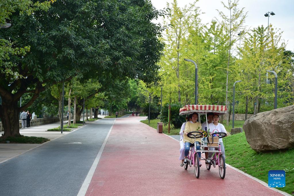 People ride along a waterside walkway in southwest China's Chongqing, Oct. 13, 2021. A 33km waterside walkway, which links six areas and eight parks in different themes along two rivers, was built in Yunyang district of Chongqing, providing residents a nice place to spend their leisure time. (Xinhua/Wang Quanchao)