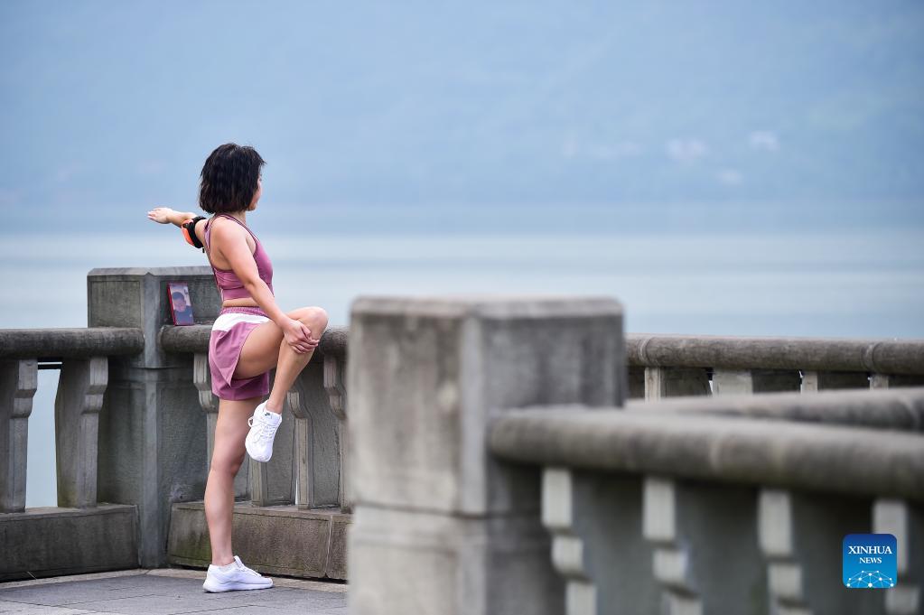 A woman exercises at at a waterside park in southwest China's Chongqing, Oct. 14, 2021. A 33km waterside walkway, which links six areas and eight parks in different themes along two rivers, was built in Yunyang district of Chongqing, providing residents a nice place to spend their leisure time. (Xinhua/Wang Quanchao)