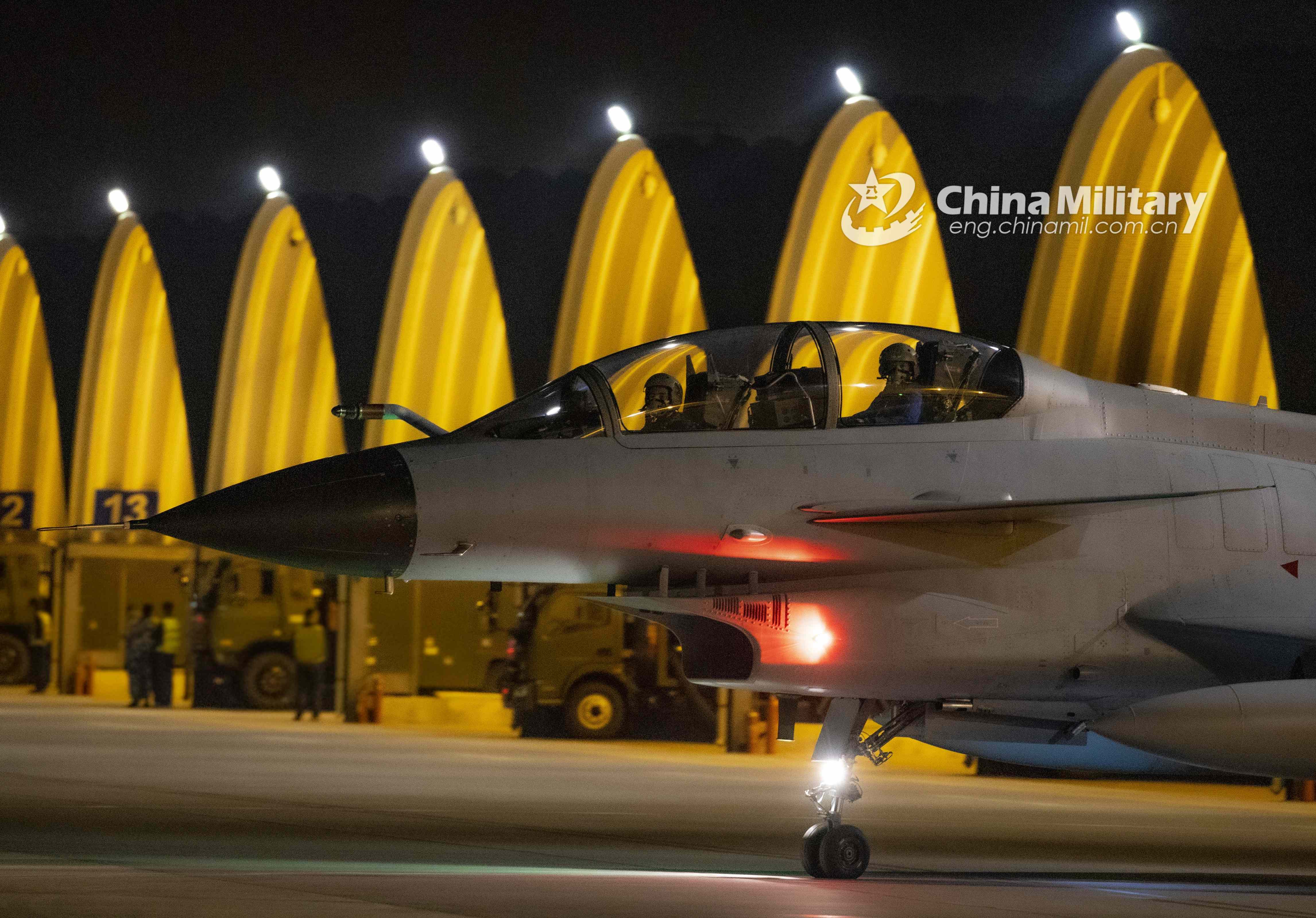 Pilots assigned to an aviation brigade of the air force under the PLA Southern Theater Command perform pre-flight procedures inside the cockpit and taxi their fighter jet out of hangar during a midnight flight training exercise on September 26, 2021. (eng.chinamil.com.cn/Photo by Wang Guoyun)