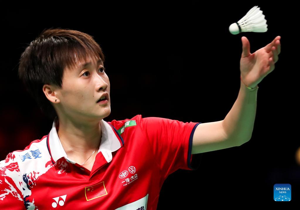 Chen Yufei of China competes in the women's singles match against Pai Yu Po of Chinese Taipei during a quarter final match at Uber Cup badminton tournament in Aarhus, Denmark, Oct. 14, 2021. (Xinhua/Zhang Cheng)