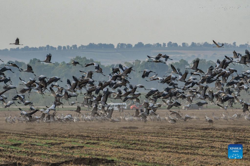 A flock of migrating gray cranes are seen at the Agamon Hula Conservation Lake in north Israel, Oct. 14, 2021. Every year, hundreds of thousands of birds past Agamon, a major stopover for migrating birds along the Syrian-African Rift, making their way to Africa then back to Europe, and some spend the winter at the Lake. (Photo by Ayal Margolin/JINI via Xinhua)