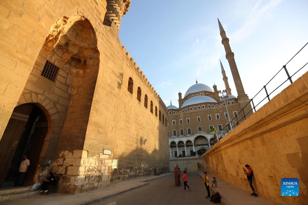 Tourists visit the Saladin Citadel in Cairo, Egypt, on Oct. 14, 2021. The Saladin Citadel, built by Saladin (1138-1193) in the 12th century, is an attraction for tourists in Cairo. (Xinhua/Sui Xiankai)