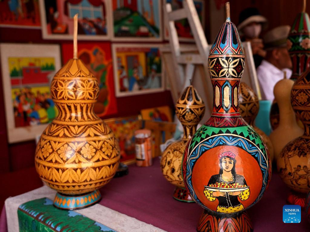 Photo taken on Sept. 27, 2021 shows artifacts with paintings created by farmers in Kumkusar Township of Makit County, northwest China's Xinjiang Uygur Autonomous Region. (Xinhua/Zhang Xiaocheng)
